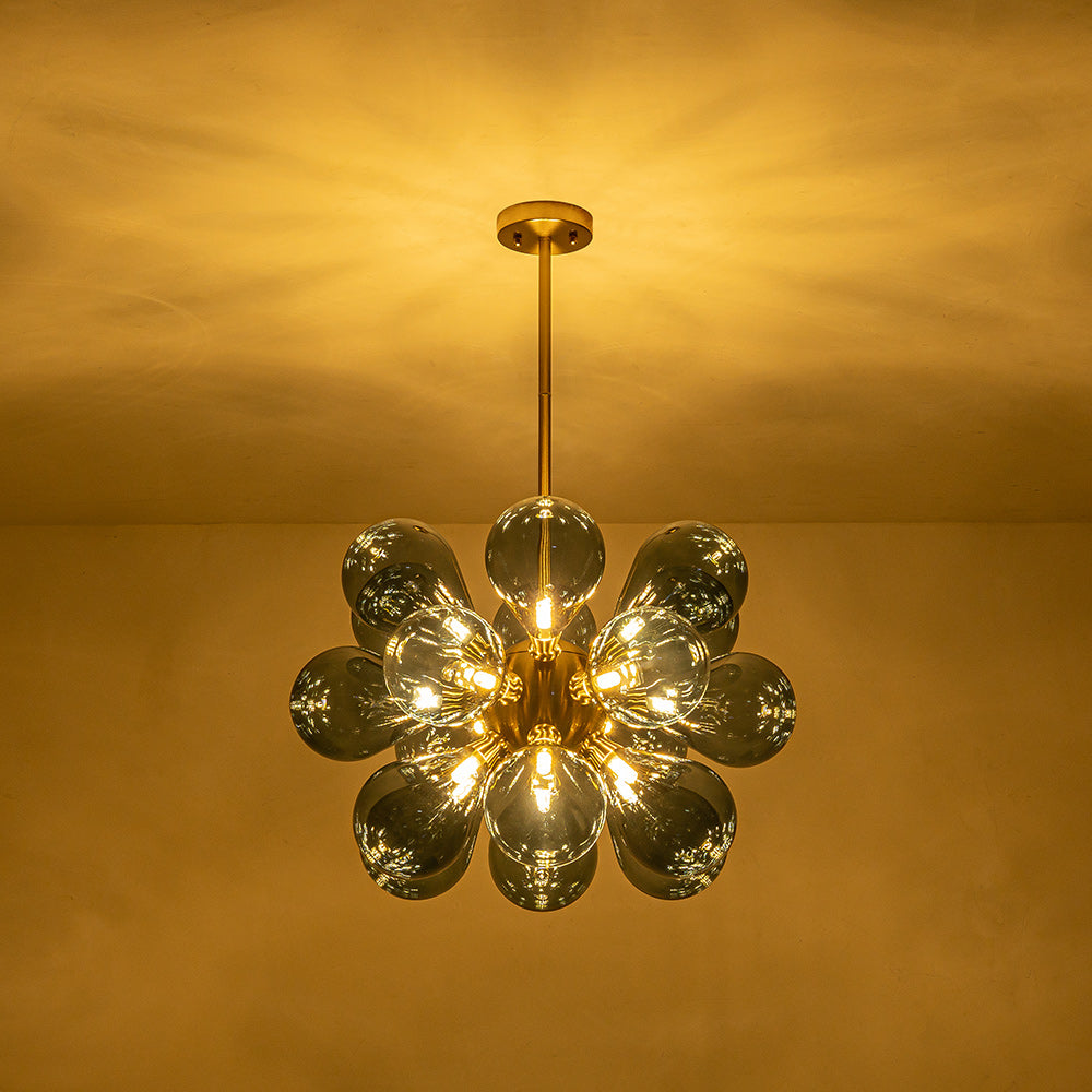 • Hand-Blown Glass Shades: Each glass shade is meticulously hand-blown by skilled artisans, resulting in unique variations in shape, texture, and color. The organic, irregular forms of the glass shades create a visually dynamic effect, while the subtle variations in hue add depth and dimension to the chandelier.