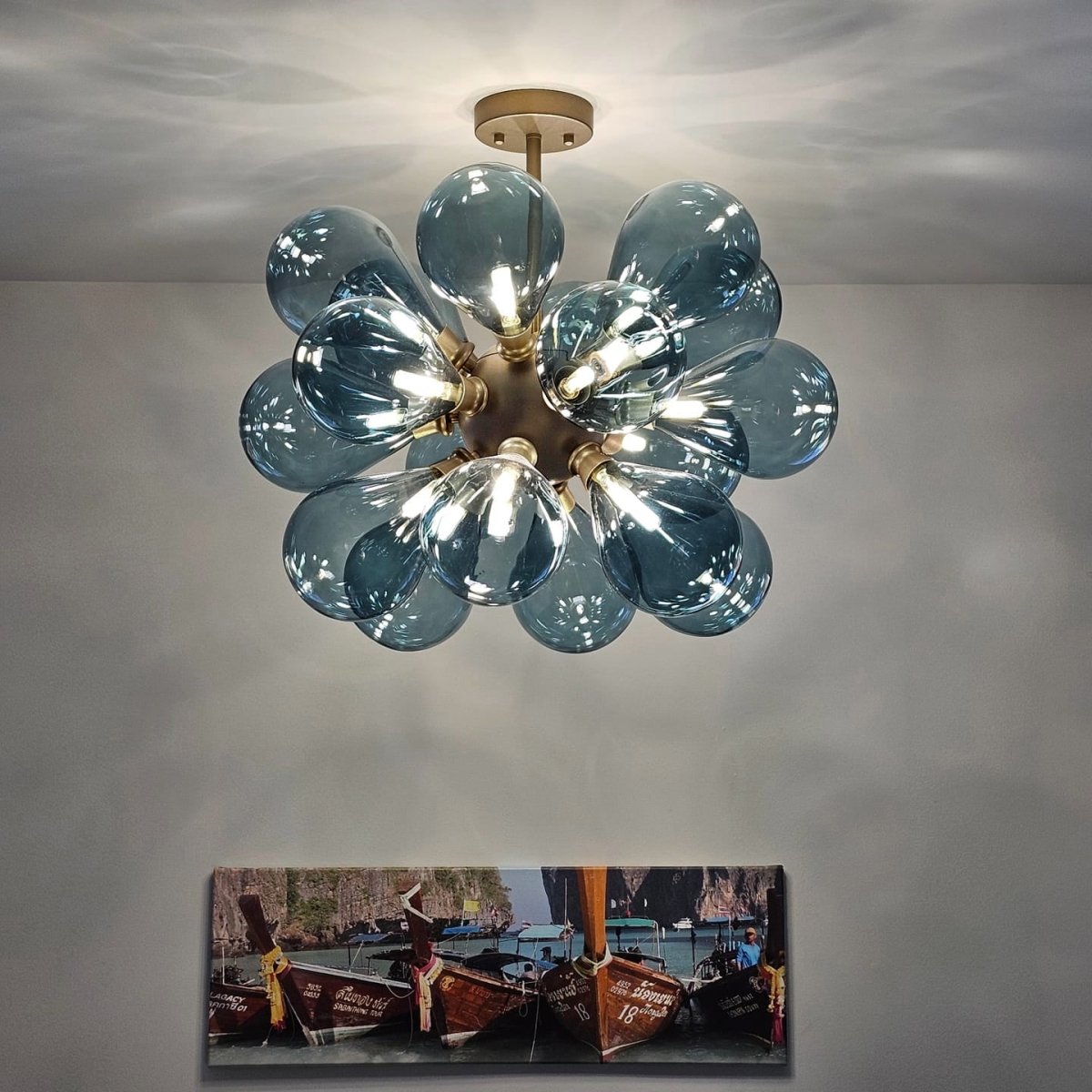 • Clustered Design: The eighteen glass shades are clustered together in a cohesive arrangement, creating a striking focal point that draws the eye and commands attention. The clustered design allows for ample illumination while adding visual interest and drama to the space.