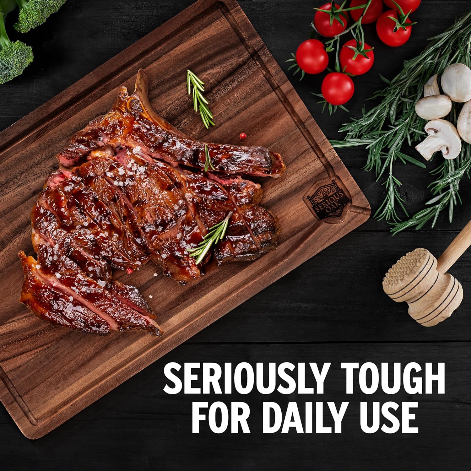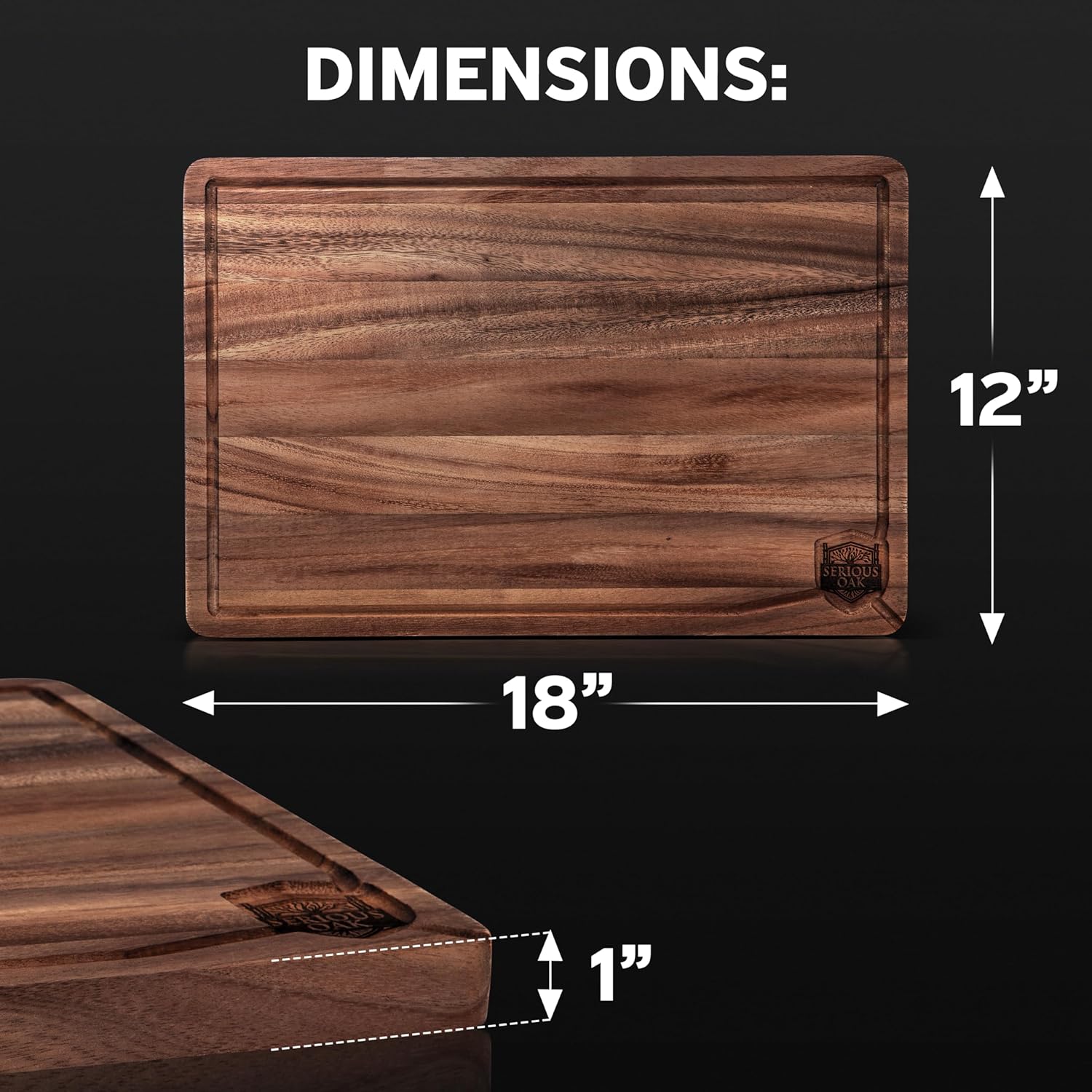 The reversible walnut cutting board is just right at 18" x 12". It's the ideal sidekick for all your kitchen tasks – slicing, dicing, chopping – you name it. This giant cutting board gives you plenty of space for easy meal prep, and guess what? It doubles as a walnut charcuterie board.