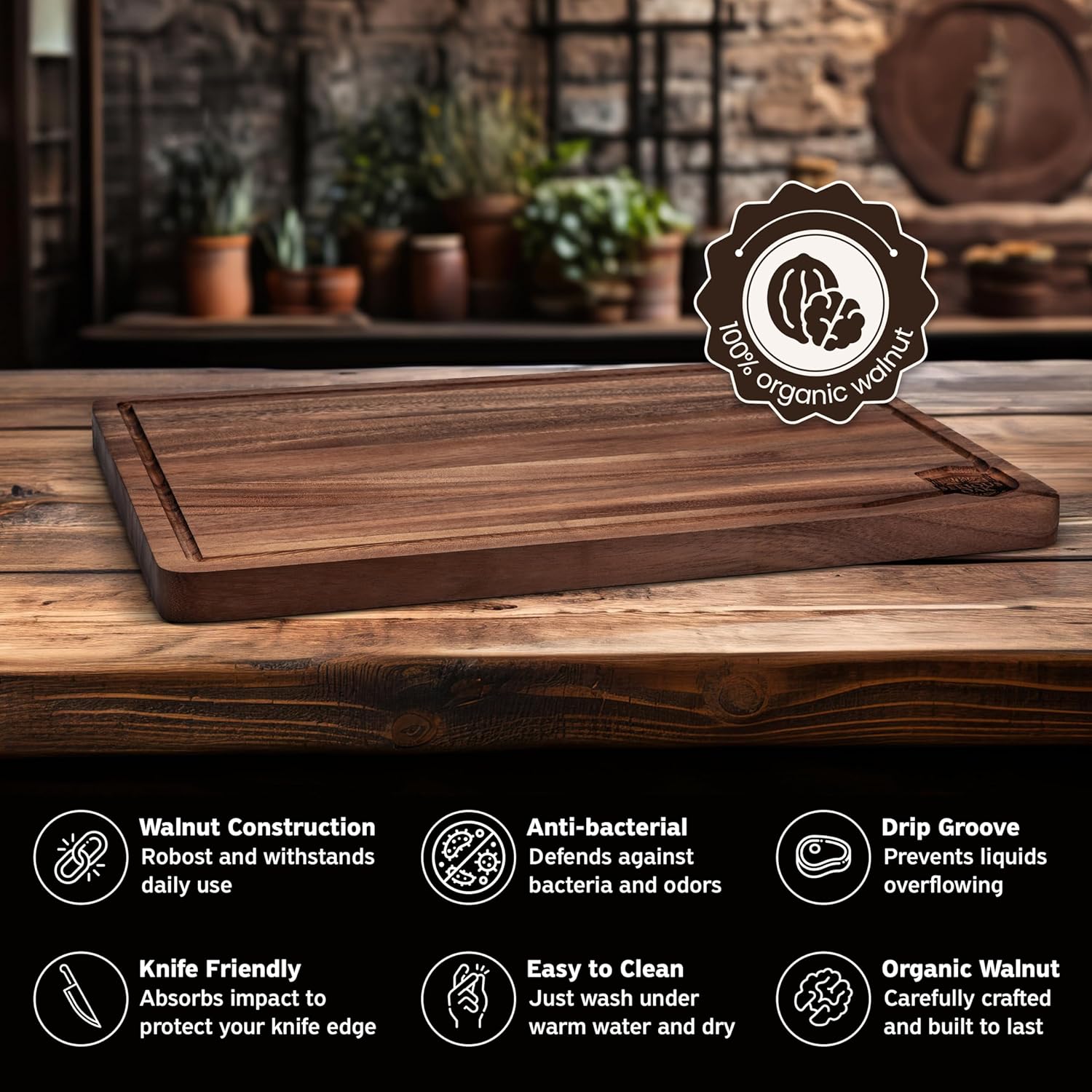 Thanks to the smart drip groove, your kitchen stays tidy. This walnut chopping board catches all the liquids, whether you're chopping fruits, veggies, or tackling a juicy steak. No more spills, just smooth cooking.
