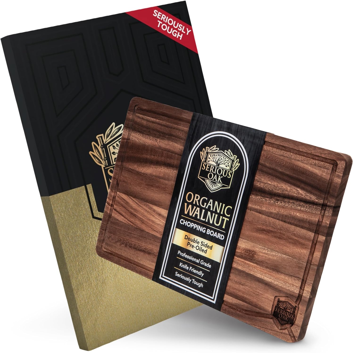 Crafted from organic walnut, this Serious Oak walnut chopping board is a powerhouse of durability, ready to withstand daily kitchen demands. The robust hardwood ensures a reliable cutting surface. No nasties here – it's finished safely, free of BPA, formaldehyde, and phthalates.