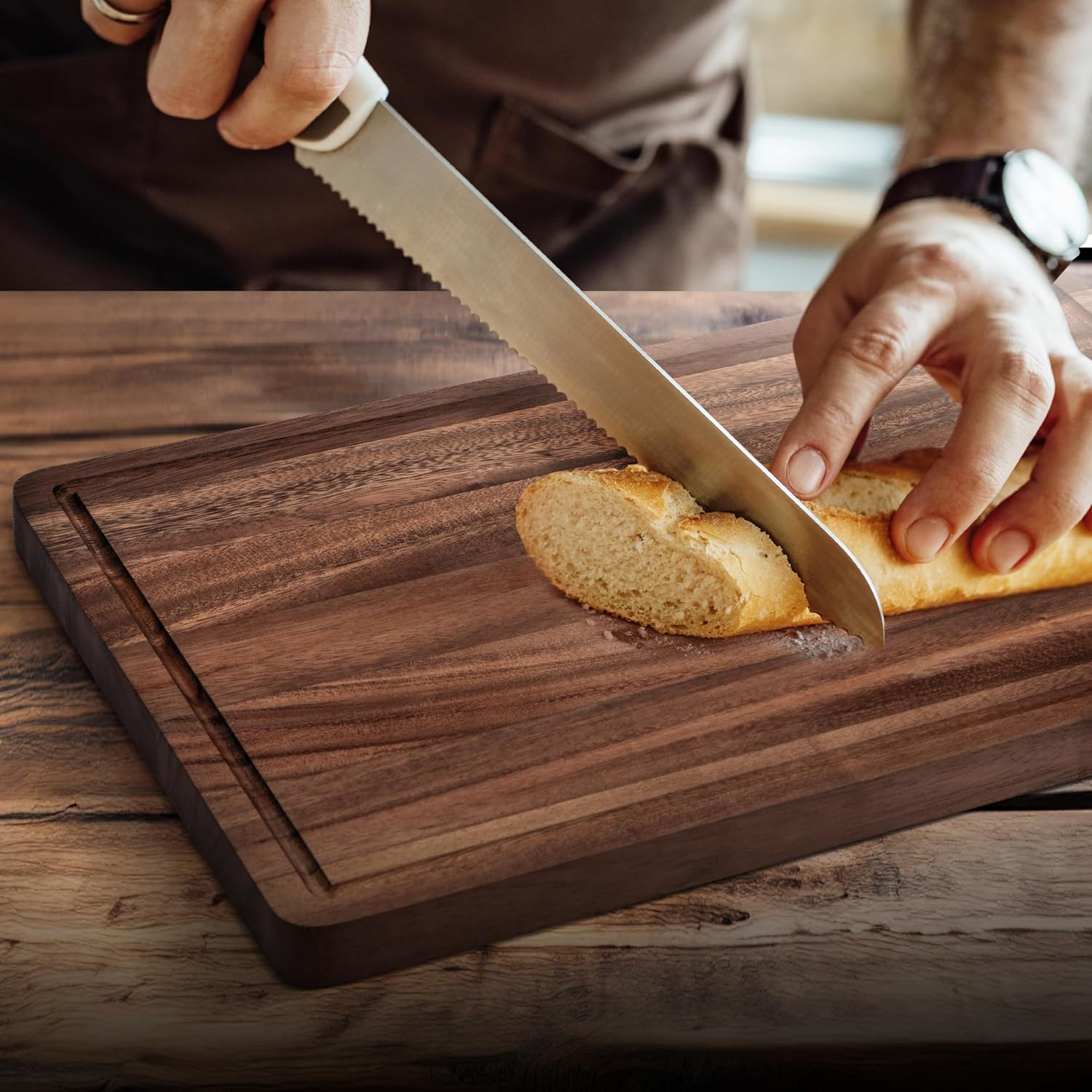 Knife-friendly and impact-absorbent, this walnut cutting board protects your knife's edge, ensuring longevity and maintaining sharpness. Experience precision cutting without compromising the lifespan of your favorite knives.