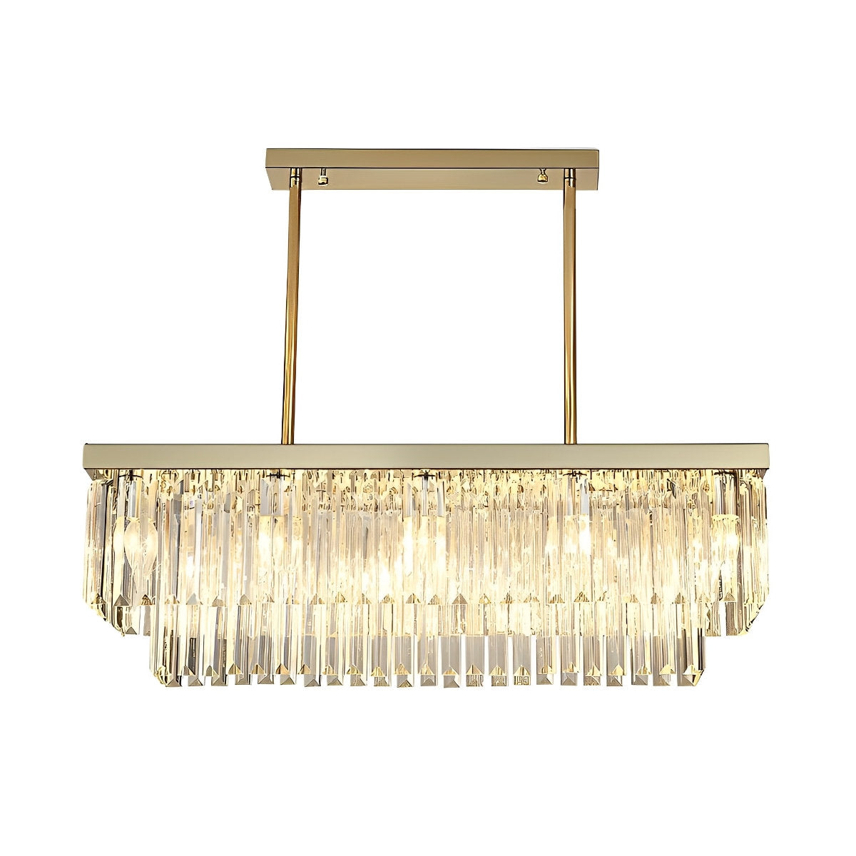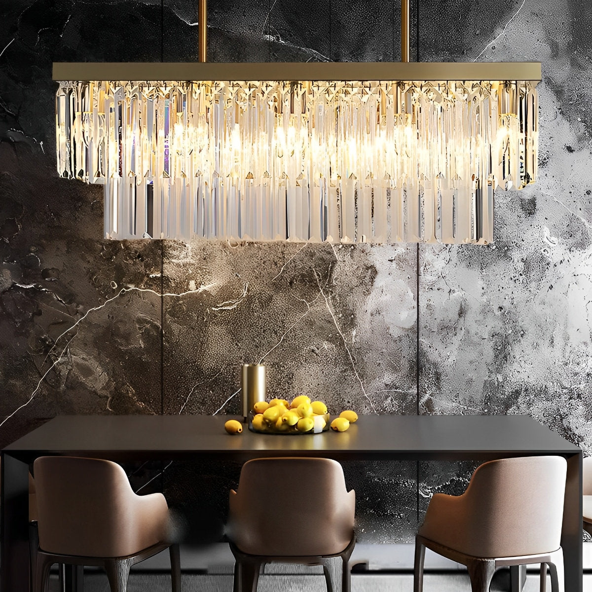 Enhance the sophistication and elegance of your home's aesthetic appeal with this amazing rectangular chandelier. It offers a blend of abstract design and a minimalist feel. The crystal strips combined with the metal frame give it the look of a jewelry item. Wherever you install it, his masterpiece will be the center of everyone's attention. And since this masterpiece is retro classic and modern at the same time, it becomes extremely suitable for any occasion. It can give you different types of experiences with this dimming feature, from a low-light romantic atmosphere to a bright room.
