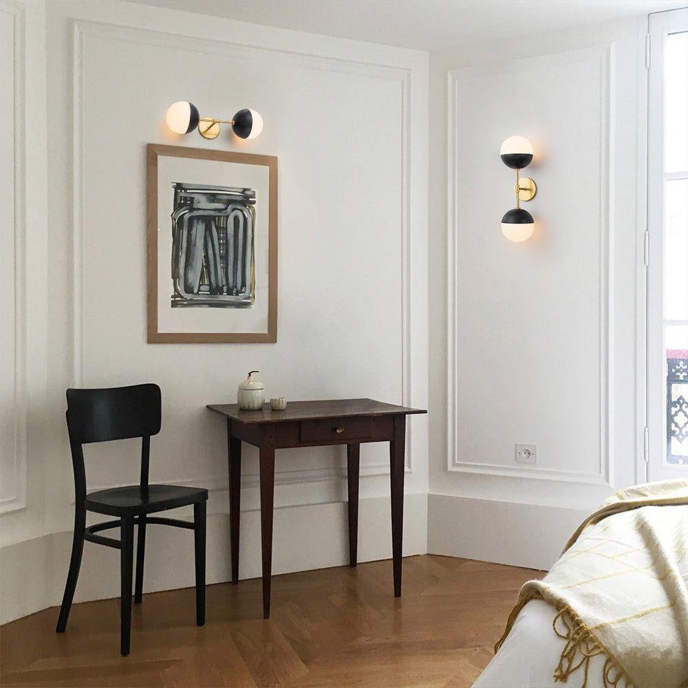 Retro-Inspired Design: Drawing inspiration from mid-century modern aesthetics, this wall sconce features a minimalist linear frame with two opal glass globe shades, capturing the essence of retro design while maintaining a contemporary appeal. The clean lines and simple silhouette make it a versatile addition to any interior décor style, from vintage to contemporary.