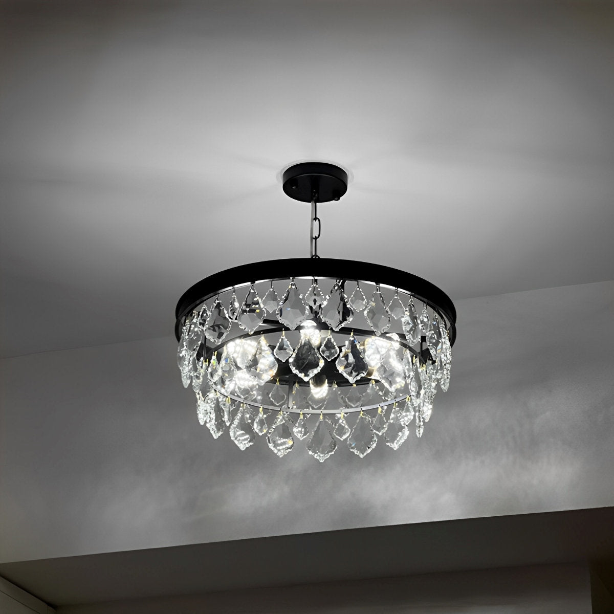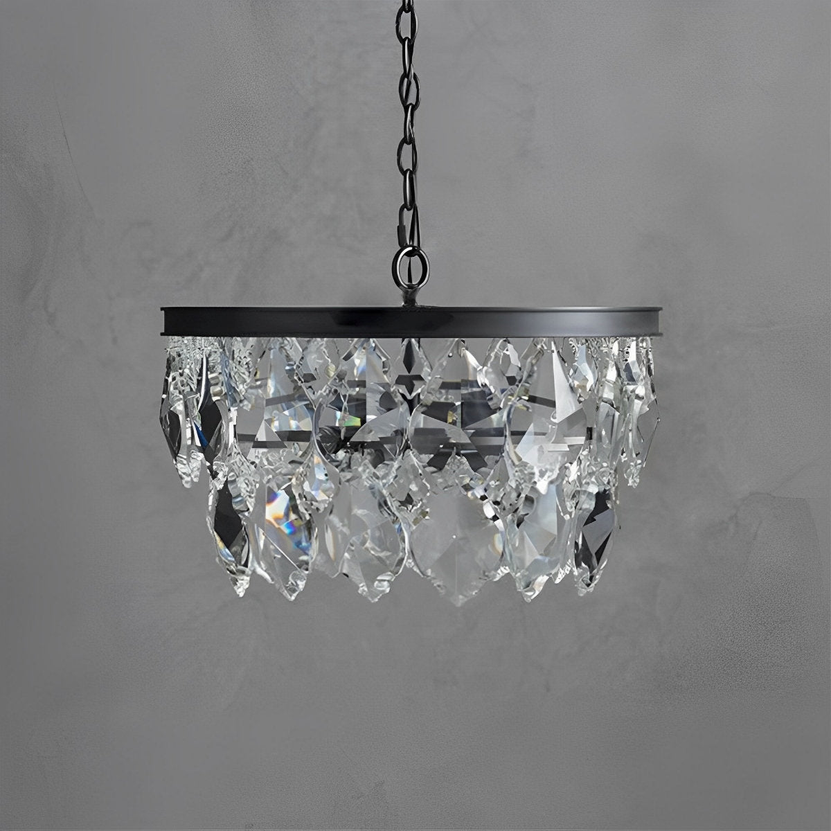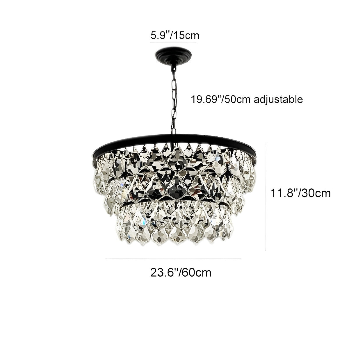 Transform your interior decor into a glowing masterpiece with this amazing modern crystal glass round raindrop chandelier. Multiple circular layers of glass raindrops give it depth and detail. It looks like several mini decor pendants are hanging from the chandelier. Its shiny crystal design gives it a luxury and premium vibe. The chain adds even more character and visual interest and shows that the design is carefully thought out. It will surely make your space more relaxing, welcoming, and joyful to be in.