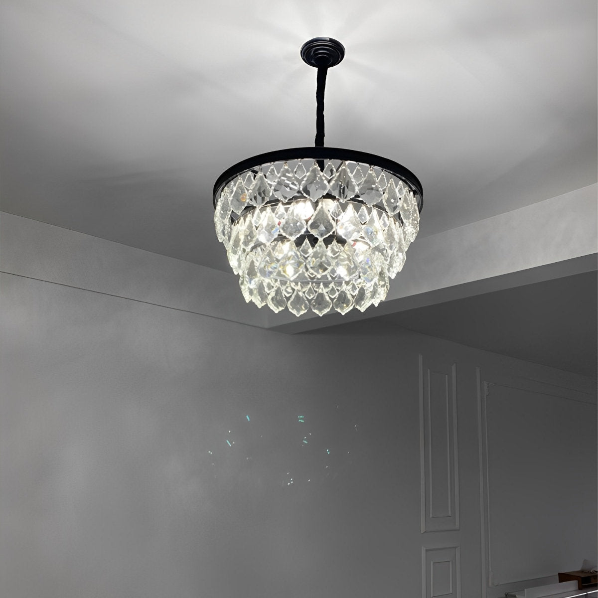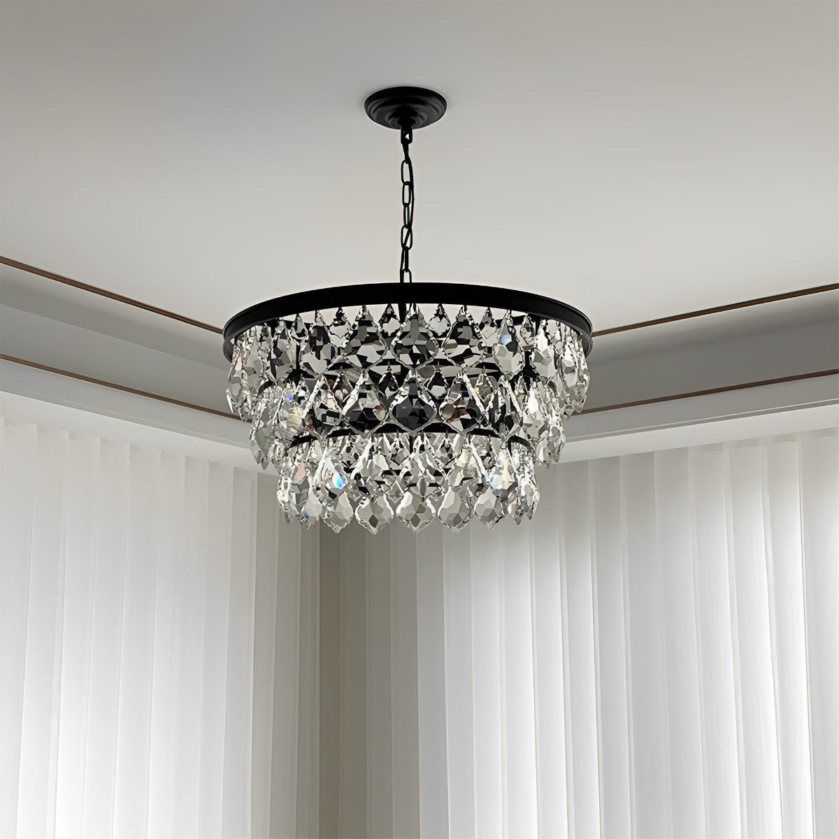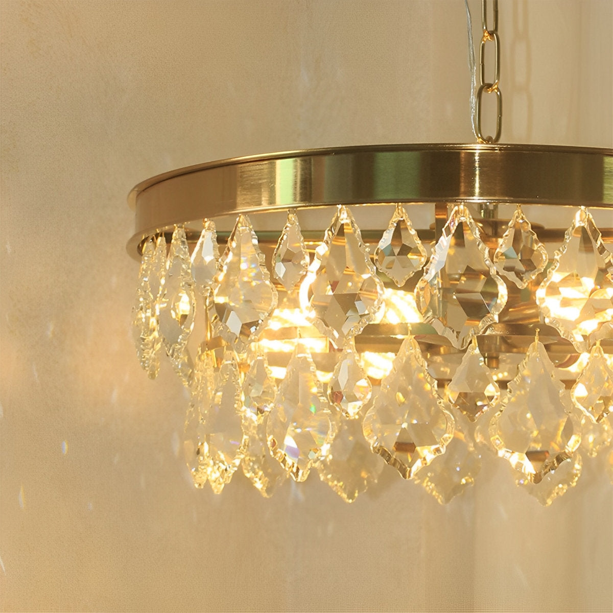 Transform your interior decor into a glowing masterpiece with this amazing modern crystal glass round raindrop chandelier. Multiple circular layers of glass raindrops give it depth and detail. It looks like several mini decor pendants are hanging from the chandelier. Its shiny crystal design gives it a luxury and premium vibe. The chain adds even more character and visual interest and shows that the design is carefully thought out. It will surely make your space more relaxing, welcoming, and joyful to be in.