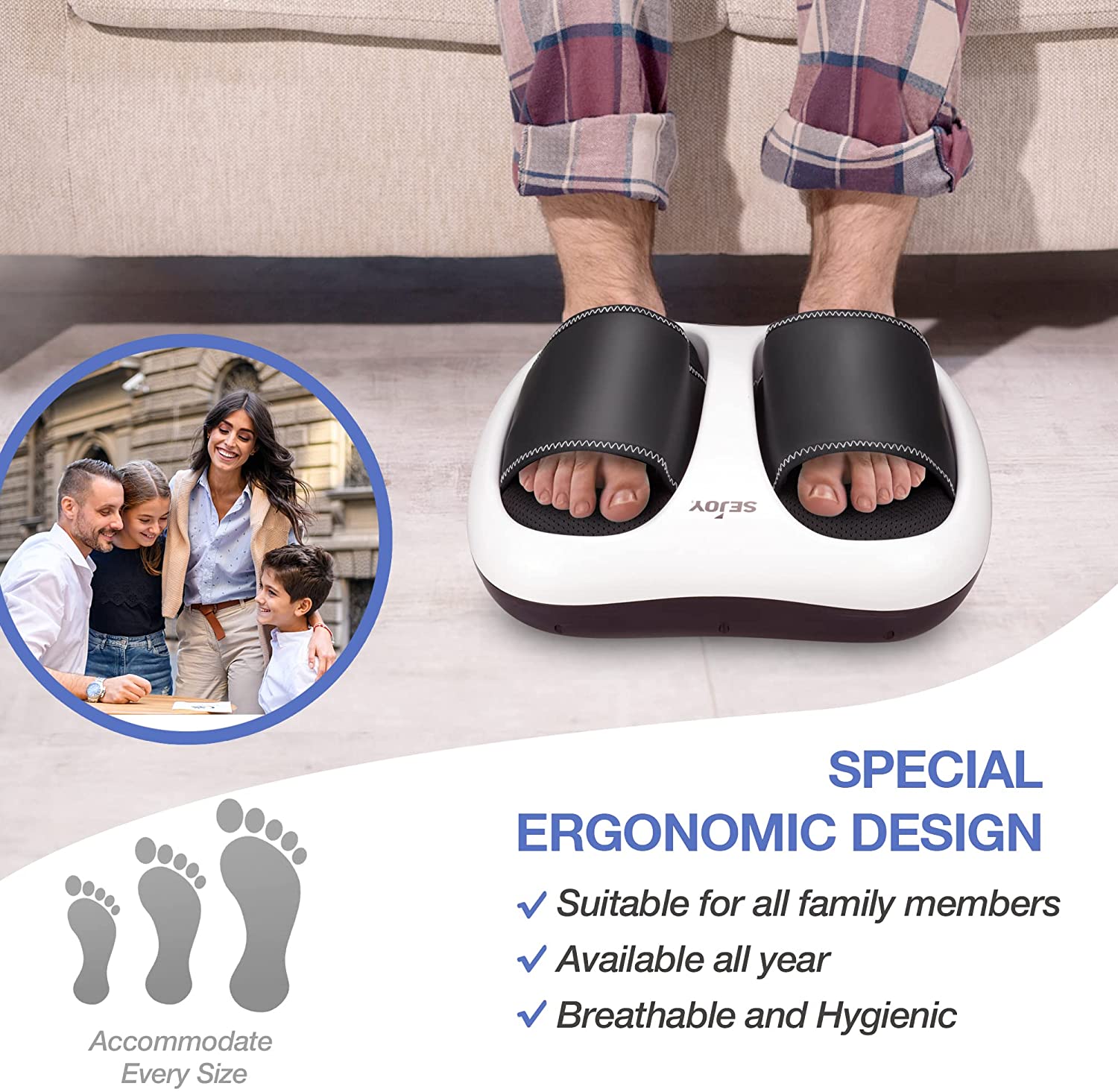 This foot massager is ergonomically designed to fit most foot sizes comfortably. It comes with easy-to-use controls that allow you to customize the massage intensity, speed, and heat settings according to your preferences.
